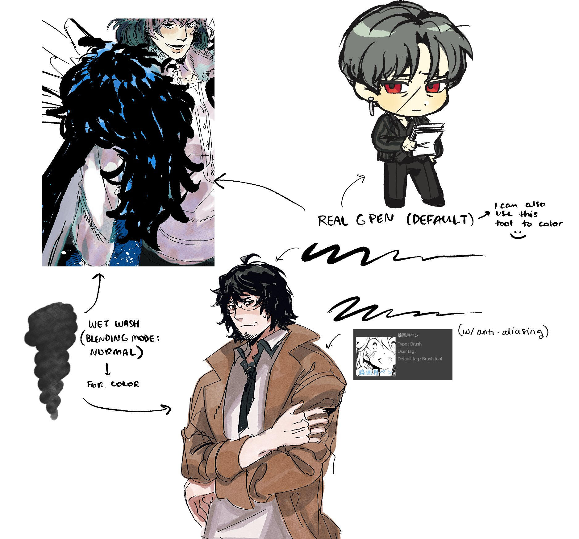 i have a few i use! below are some examples + how i use them.i use an ipad (7th gen) and the art app i use is clip studio paint!DRIVE / 線画用ペン PEN / じわペン PENSHARPENING AUTO ACTION