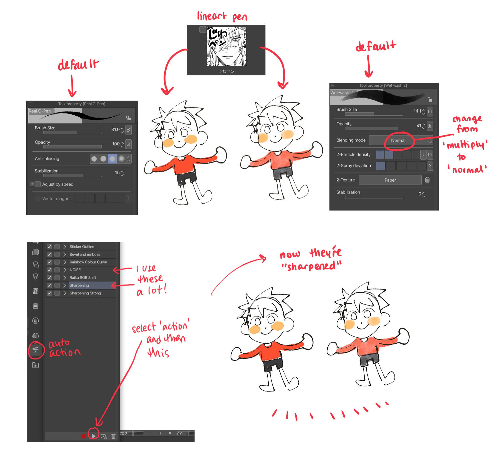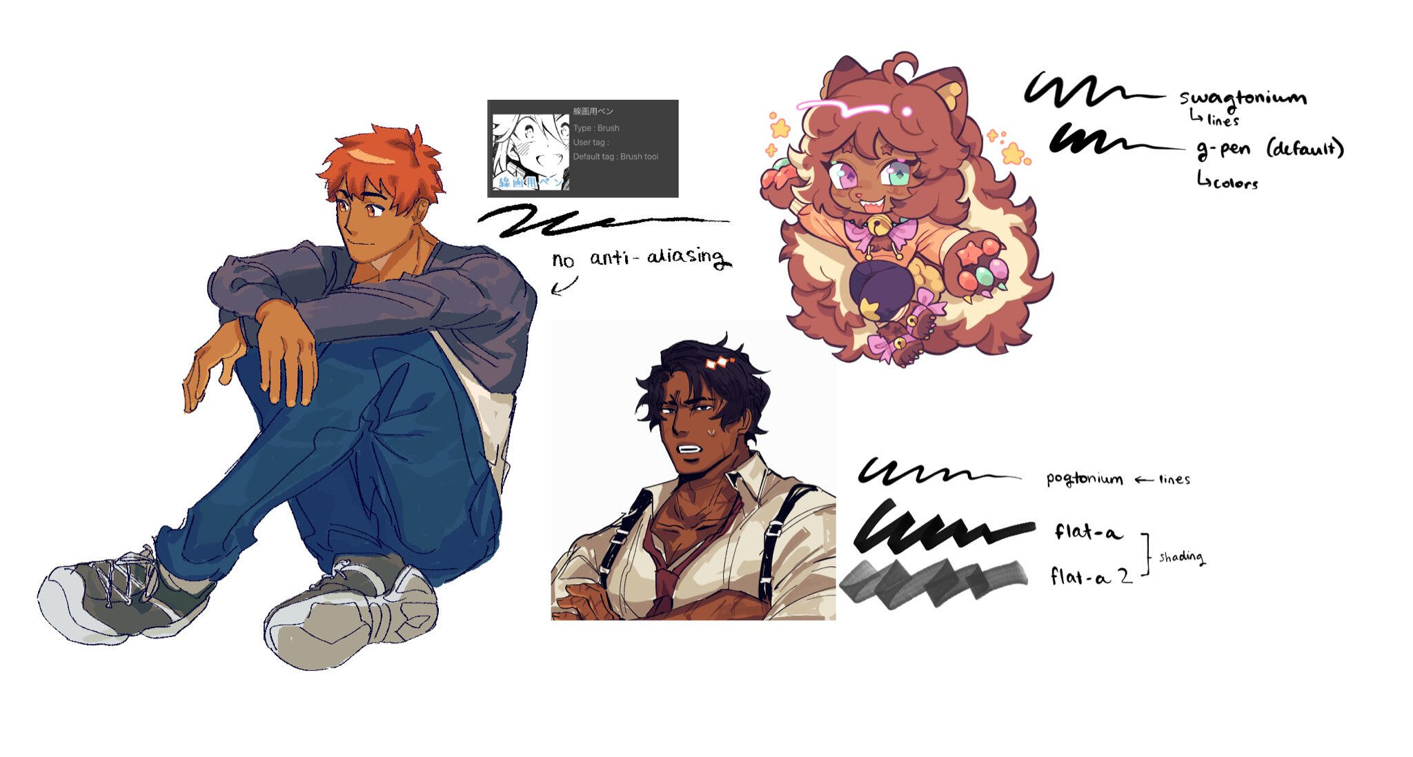 i have a few i use! below are some examples + how i use them.i use an ipad (7th gen) and the art app i use is clip studio paint!DRIVE / 線画用ペン PEN / じわペン PENSHARPENING AUTO ACTION